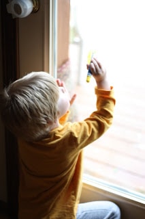 Some of the earliest coloring Little Guy did was to decorate a window for me! I was laughing and upset all at the same time….and left it for Daddy to see when he got home. And then we forgot and it was up there for almost a week. Oops. A little WD-40 and it came right off (works on walls too) and then we just cleaned the window like normal to make sure no WD-40 was left on there.