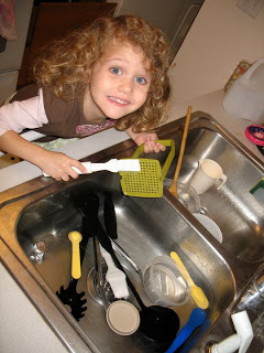 “I filled up the sink with water and grabbed a bunch of non-sharp kitchen items. She goes crazy with excitement every time we do this and would spend hours, if I let her, playing in this way. She pours water back and forth in different containers, scoops it with various utensils, and does all sorts of creative things that I would never dream of. It’s fun to listen to her talk and sing. On a couple of occasions I’ve even let her “clean” a few plastic dishes with a soapy sponge (this gets quite a bit messier).