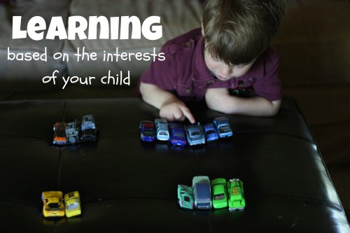 I’m the biggest fan of this type of learning. My son loves to play with his Thomas trains, so we found little blocks to put in the cars. He uses them for addition.