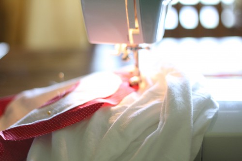 1. Trace circles from your fabric. I used a dinner plate, salad plate, and large cup. Cut the largest and smallest from the red fabric and the medium-sized circle from the white fabric.