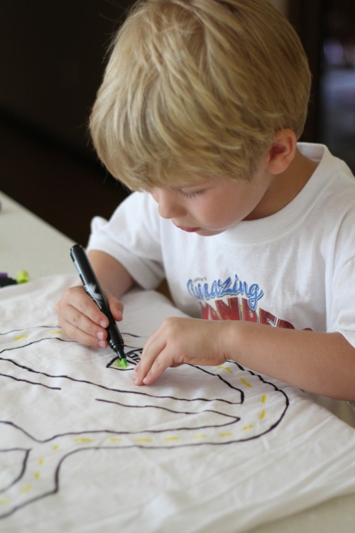 6. Let your little helpers use the fabric markers to add some color to the shirt. Ask your child to help you think of other places to add to the shirt.