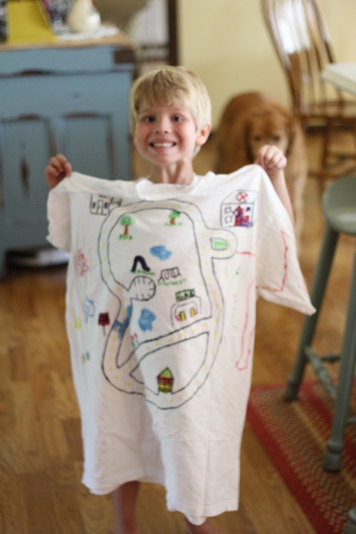 5. Turn the shirt over and draw a car track on the back of the shirt. I didn’t use a pattern (which I probably should have), I just made it up as I went along and used a Sharpie.