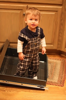 Little Brother’s favorite “toy” right now is this clothespin drop I made around his first birthday. He loves it! He also loves to open and shut cabinet doors, so we have a few in our kitchen that are “Little Brother proof” without latches.