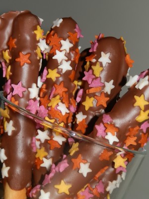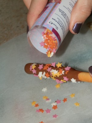 The perfect snack to go with a babyccino is a homemade chocolate wand. Simply melt a bar of milk chocolate in a bowl over a pan of simmering water, and use a spoon to cover plain breadstick halves with the melted chocolate, letting any excess drip off. Sprinkle over some sprinkles, and place on a sheet of greaseproof baking paper.